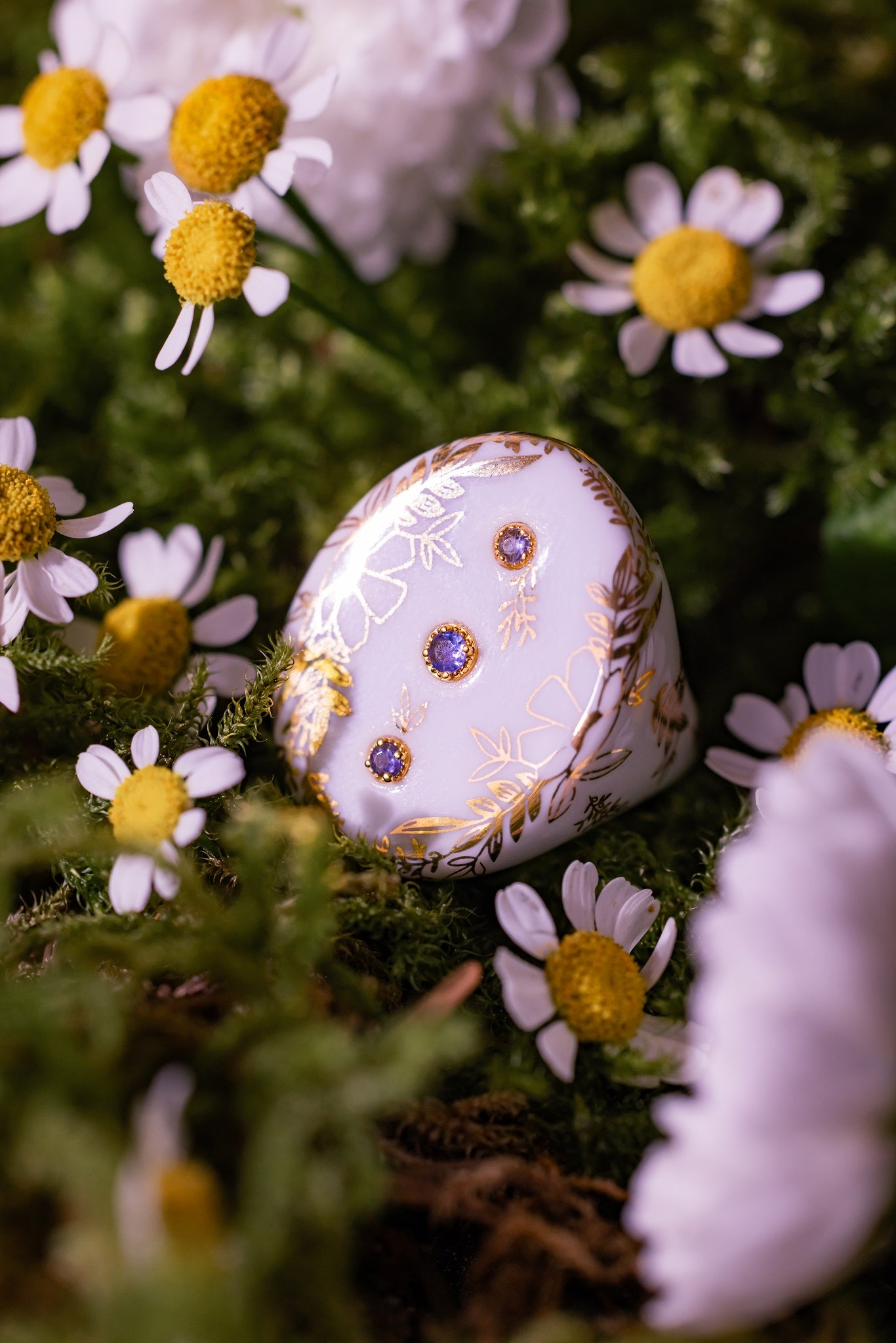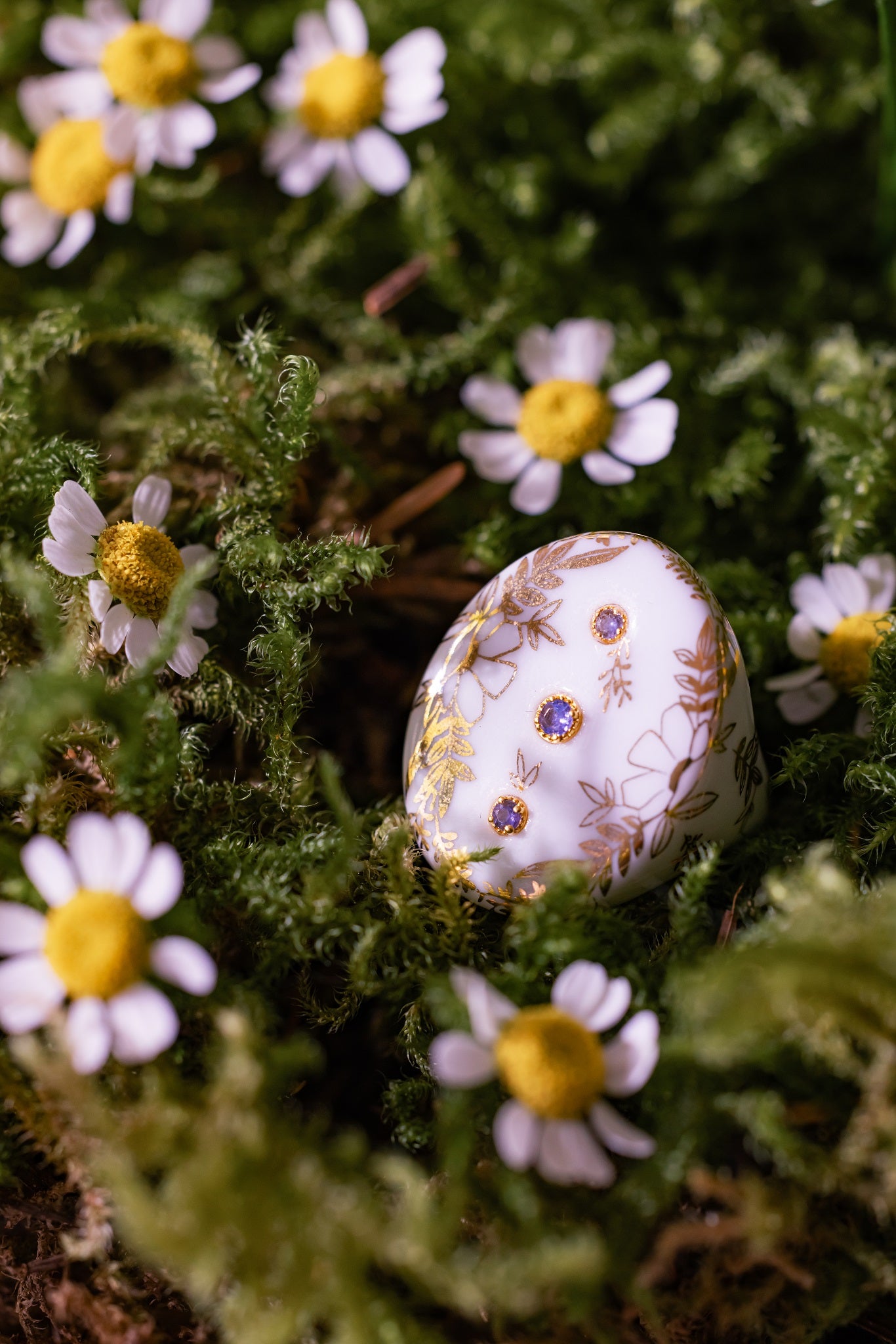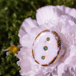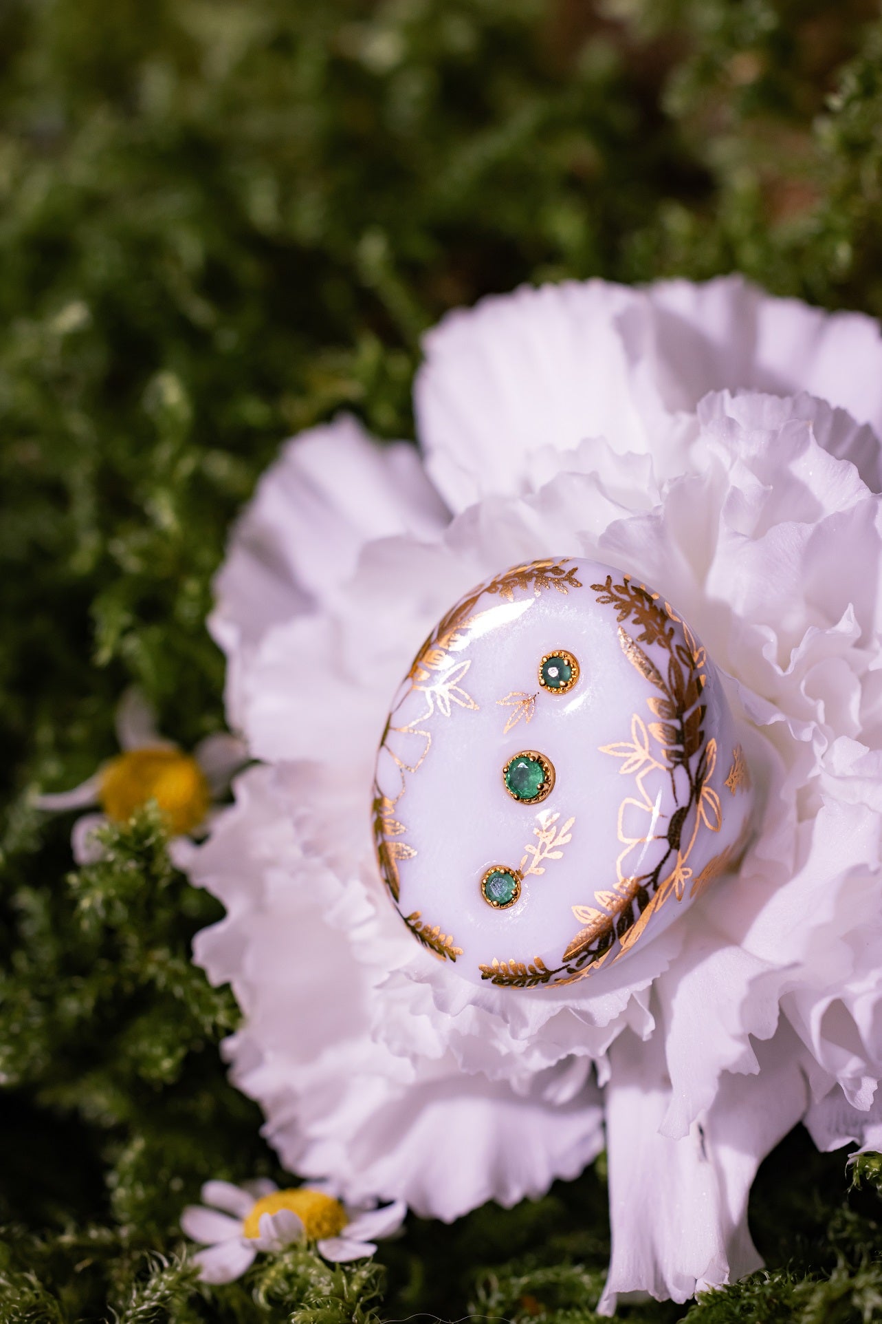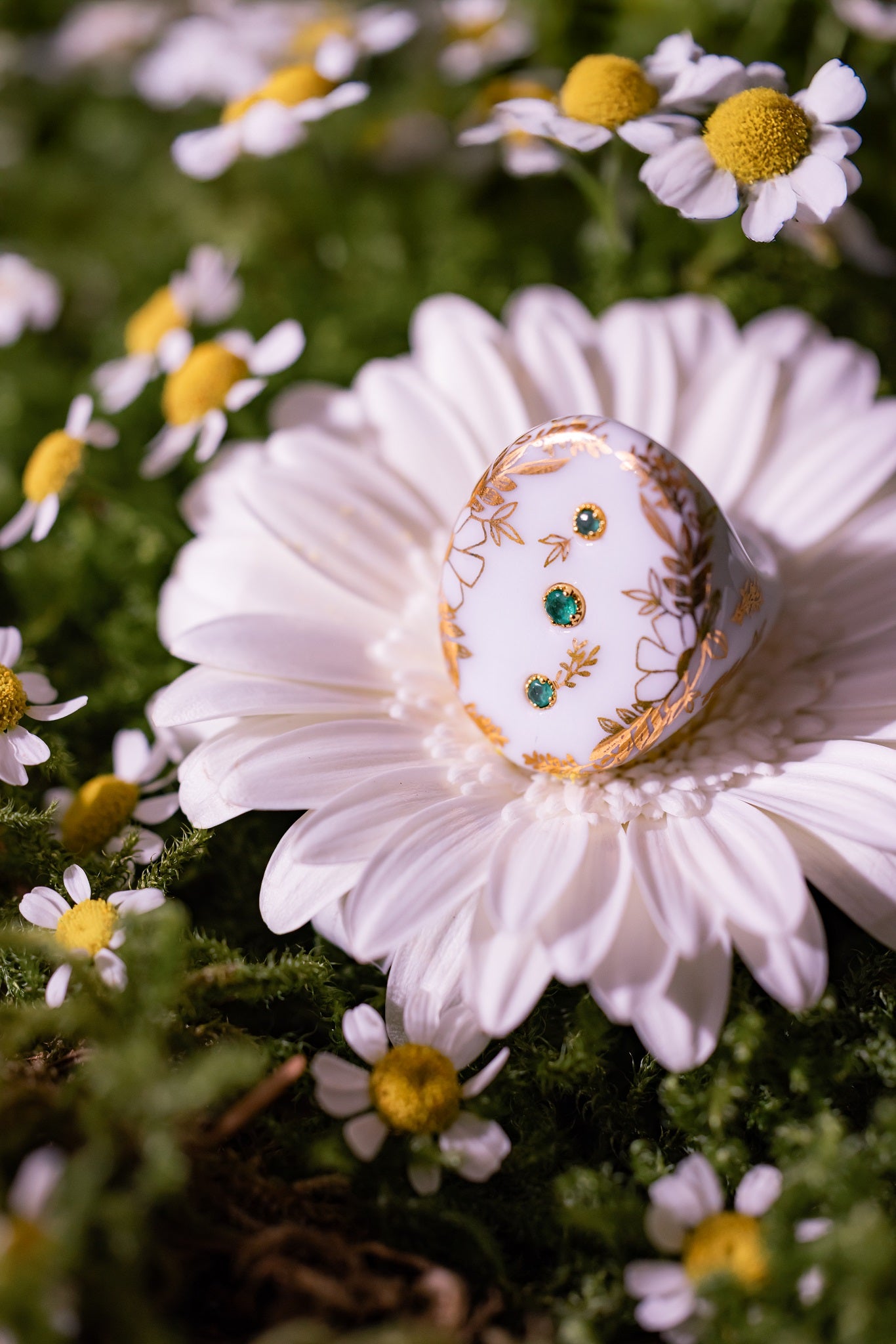 Trois pierres fines serties, nichées comme suspendues dans un tableau de fleurs des champs.