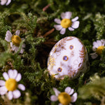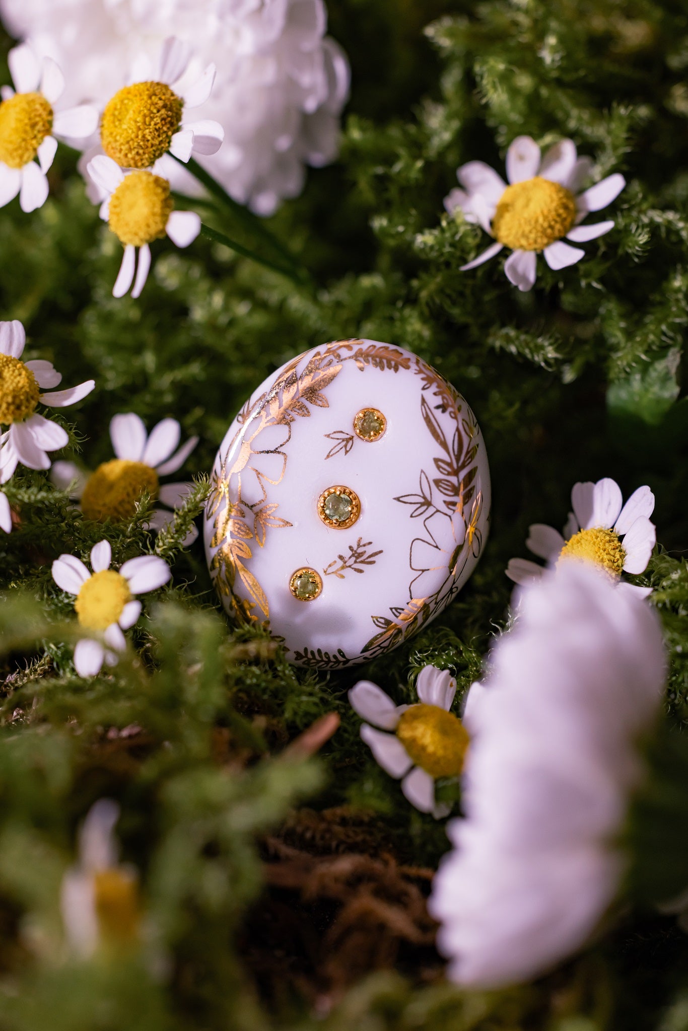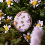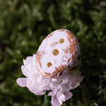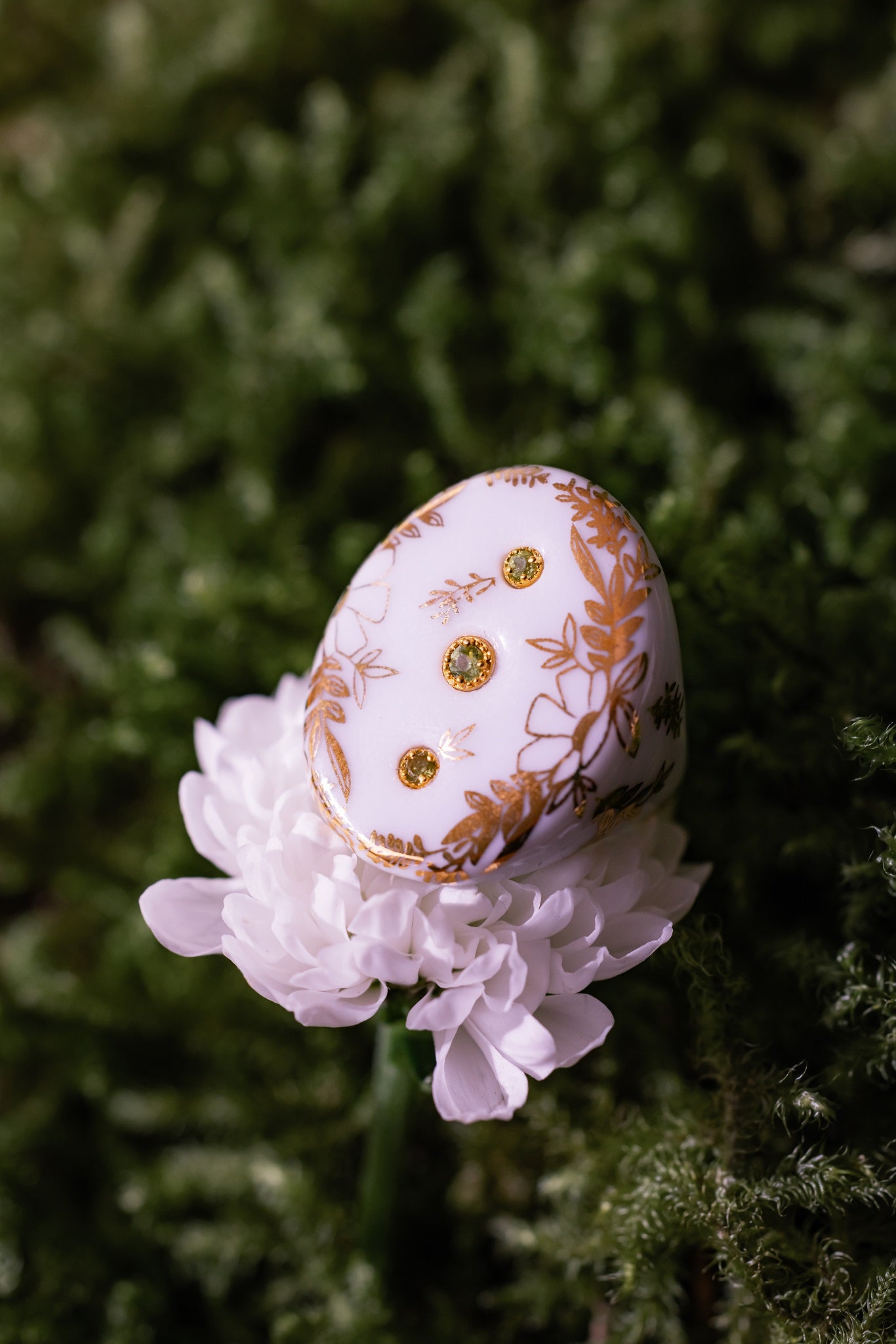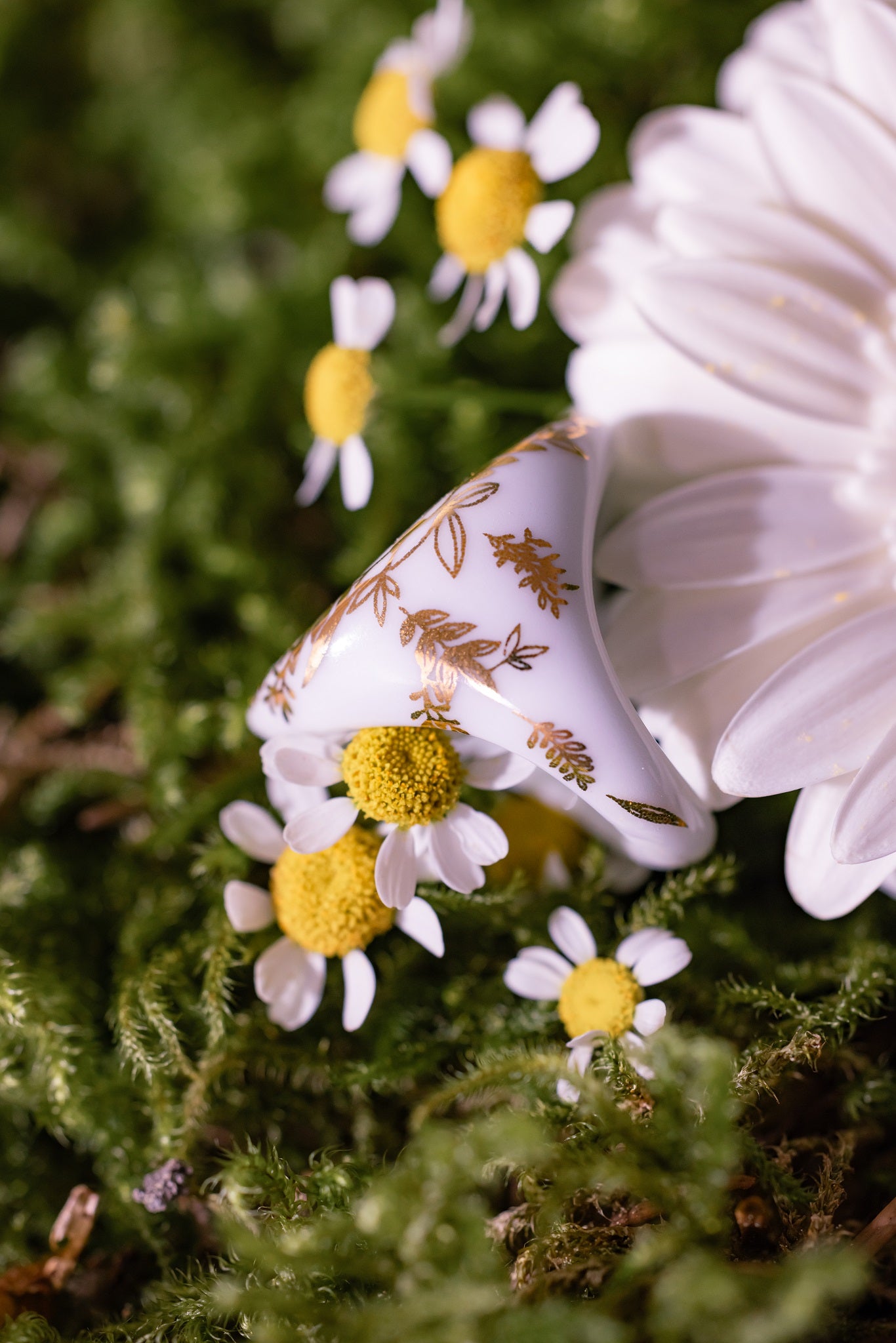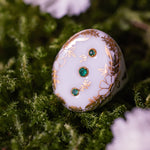 Trois pierres fines serties, nichées comme suspendues dans un tableau de fleurs des champs.