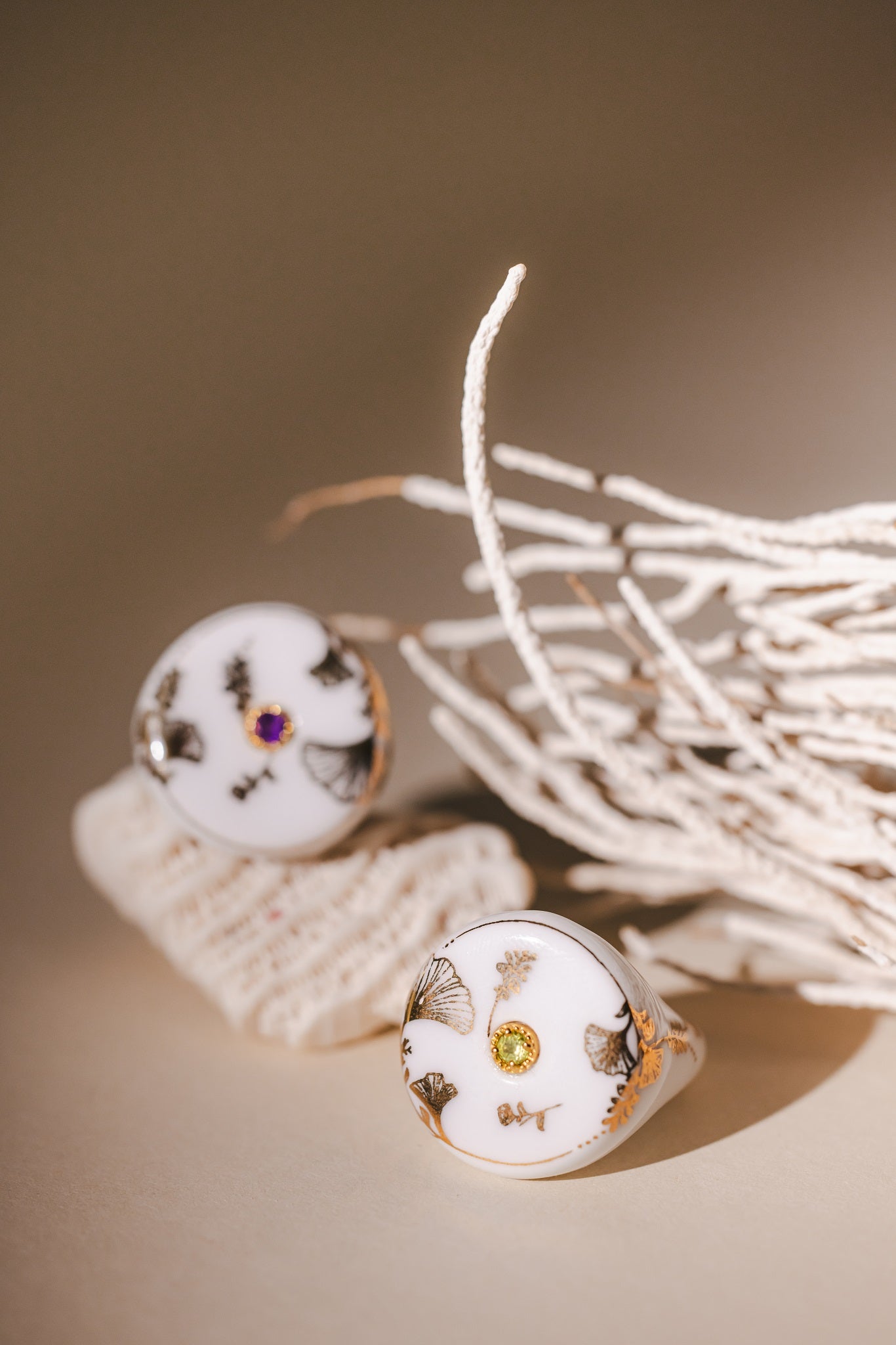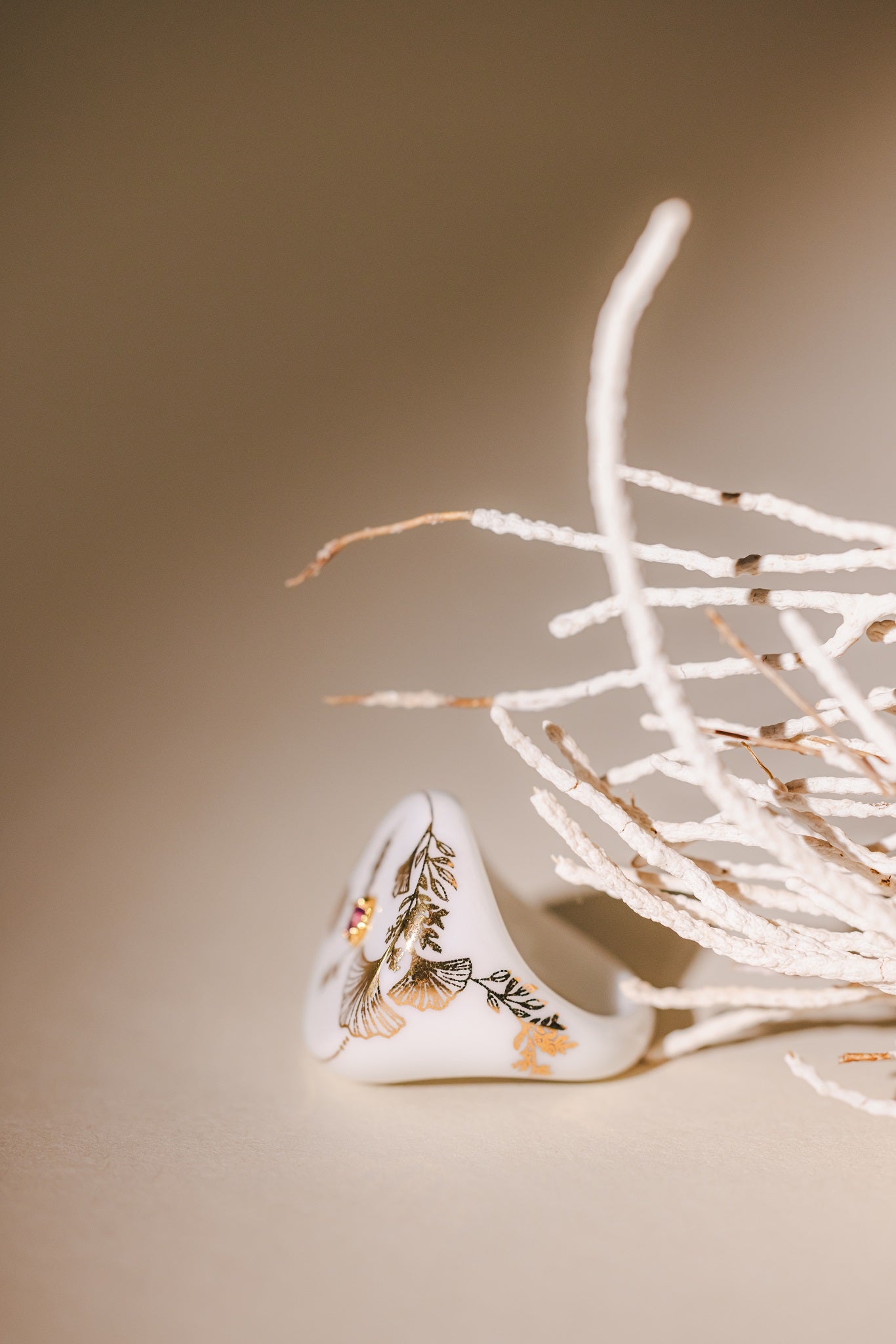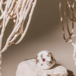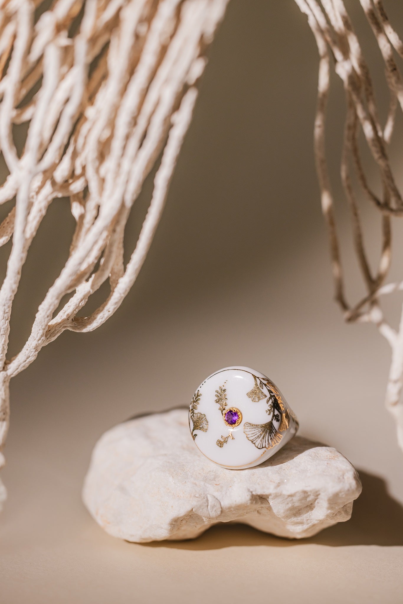 La bague Gingko, ornée d’une pierre précieuse, illumine son design raffiné d’une touche d’éclat subtil.
