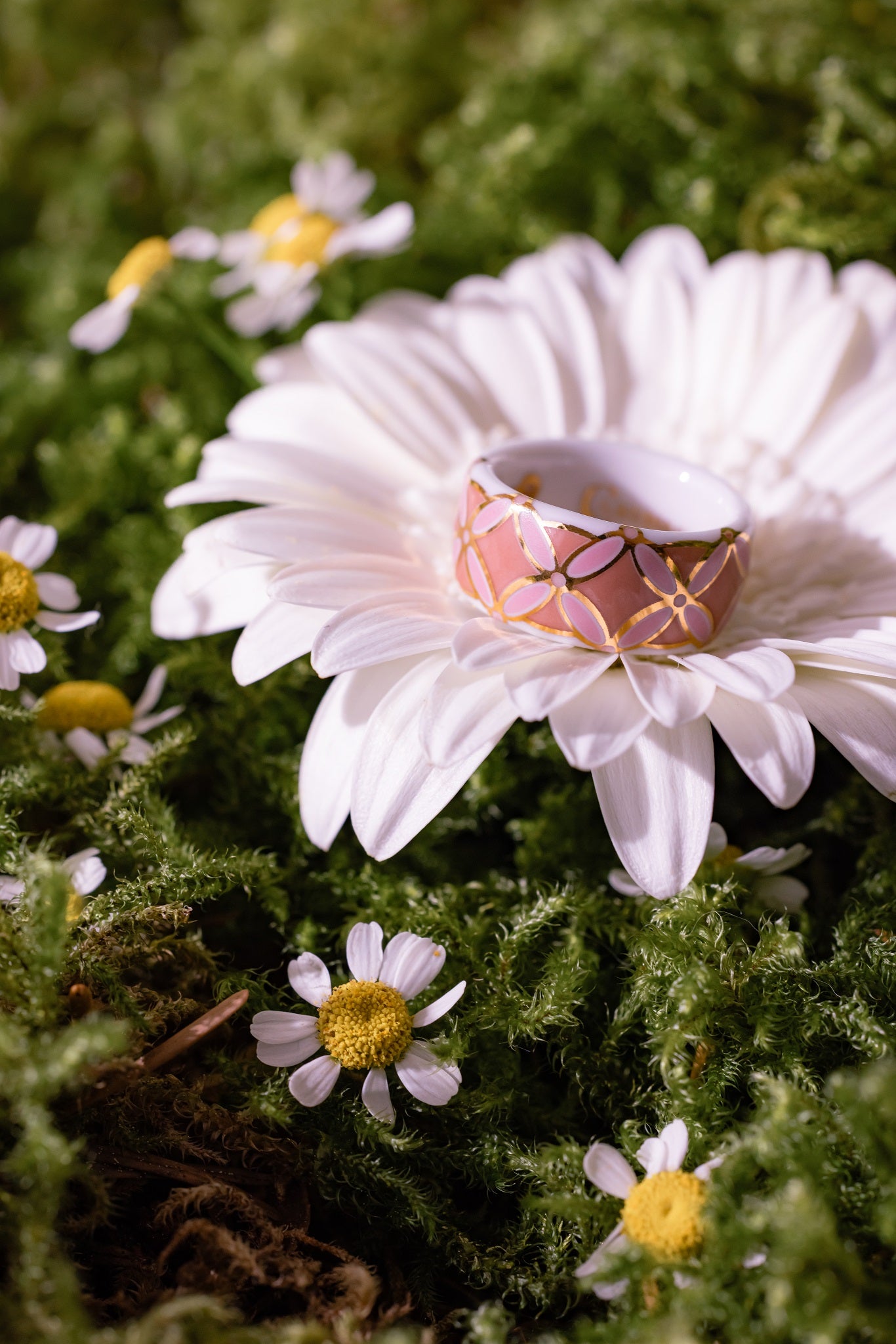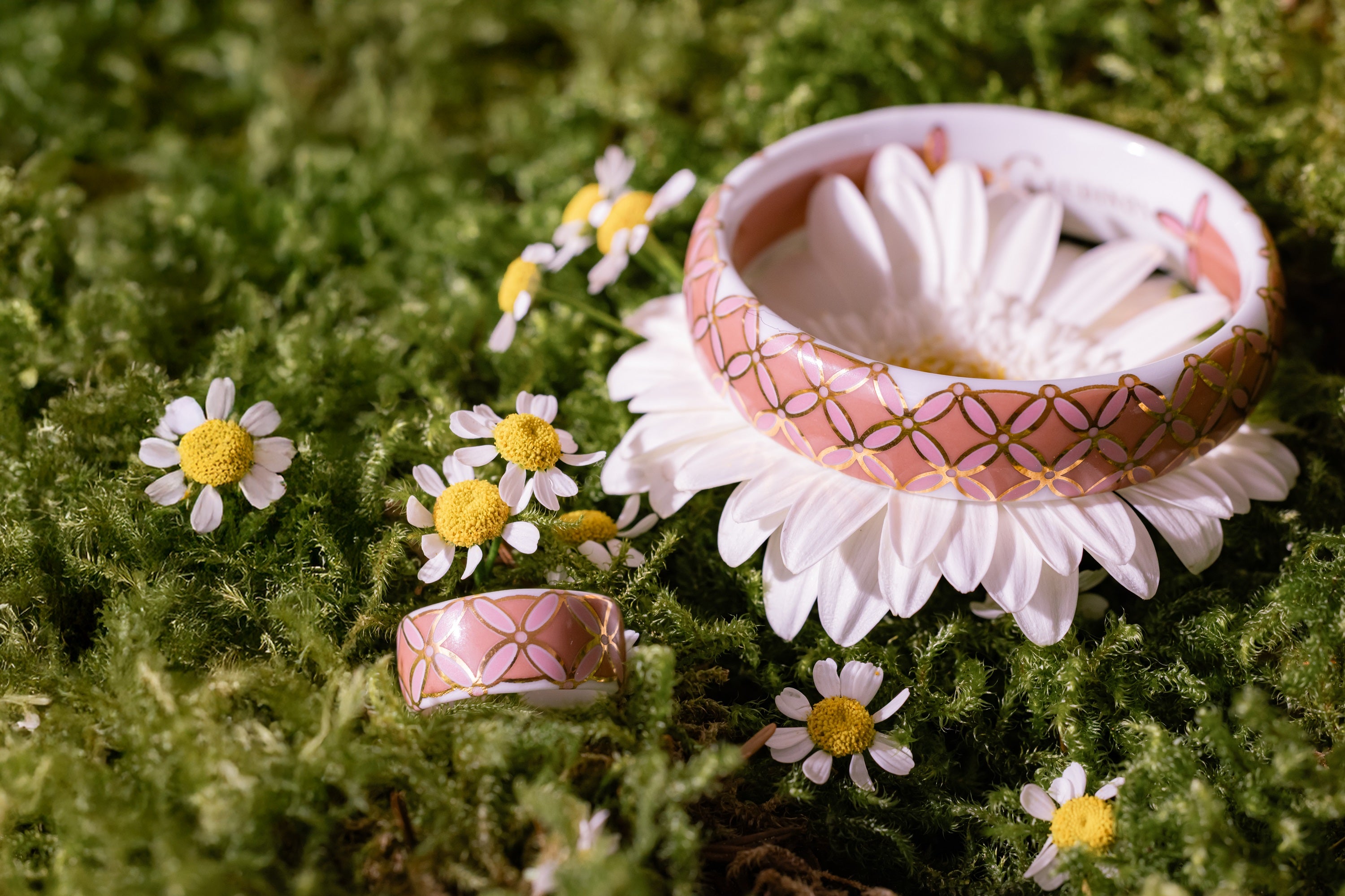 Des lignes géométriques, des motifs graphiques comme des parterres de fleurs émaillées sur la porcelaine.